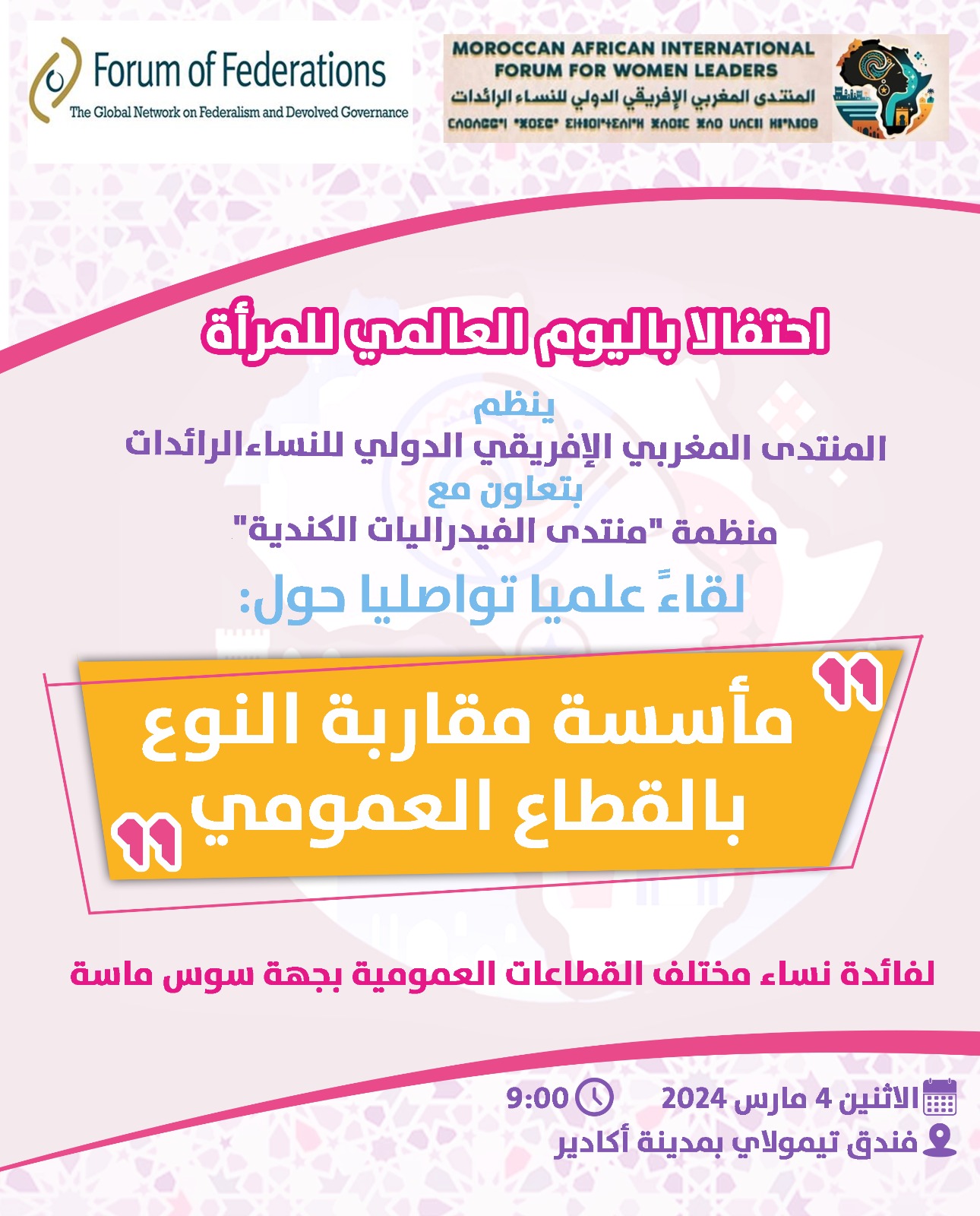 تخليدا لليوم العالمي للمرأة الذي يصادف يوم الثامن مارس من كل سنة، واعترافا بالمجهودات والتضحيات الجسام والأداء المتميز الذي تقوم به نساء القطاع العام بجهة سوس ماسة ينظم المنتدى المغربي الإفريقي الدولي للنساء الرائدات بدعم من منظمة “منتدى الفيدراليات الكندية” لقاء علميا تواصليا حول موضوع: “مأسسة مقاربة النوع بالقطاع العام”، وذلك يوم الاثنين 4 مارس2024 ابتداء من الساعة التاسعة صباحا بمدينة أكادير، لفائدة 50 سيدة من مختلف القطاعات العمومية بجهة سوس ماسة.