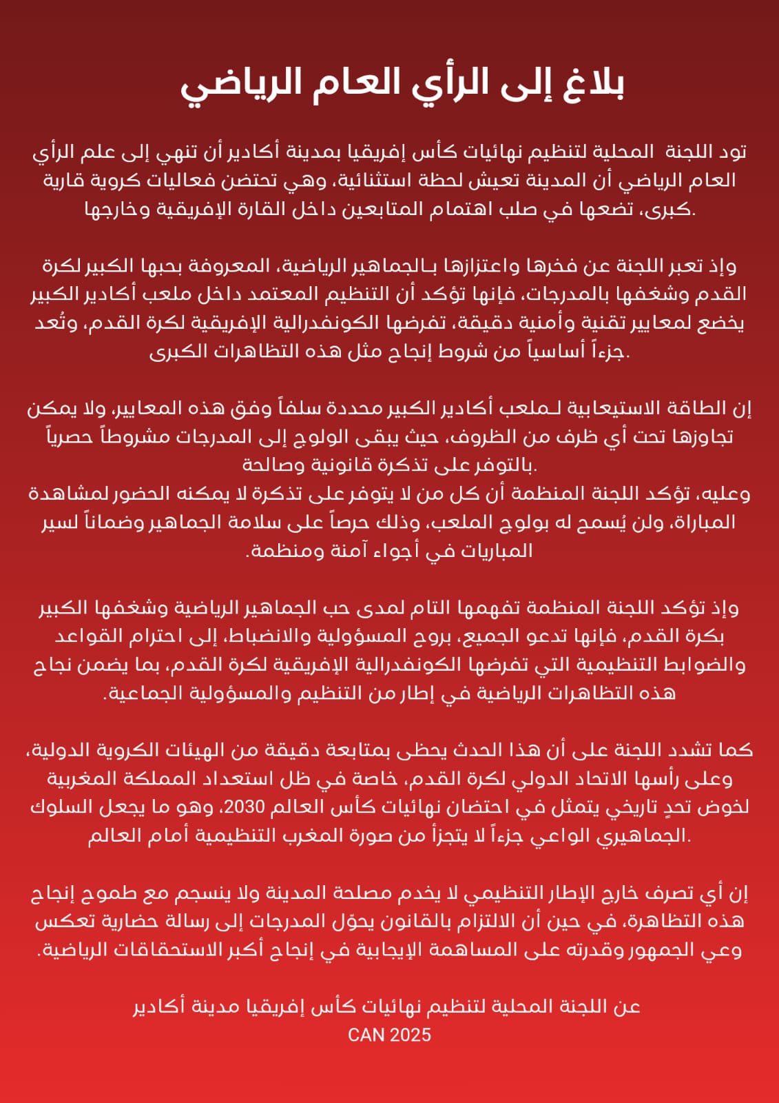 وإذ تعبر اللجنة عن فخرها واعتزازها بالجماهير الرياضية، المعروفة بحبها الكبير لكرة القدم وشغفها بالمدرجات، فإنها تؤكد أن التنظيم المعتمد داخل ملعب أكادير الكبير يخضع لمعايير تقنية وأمنية دقيقة، تفرضها الكونفدرالية الإفريقية لكرة القدم، وتُعد . جزءاً أساسياً من شروط إنجاح مثل هذه التظاهرات الكبرى