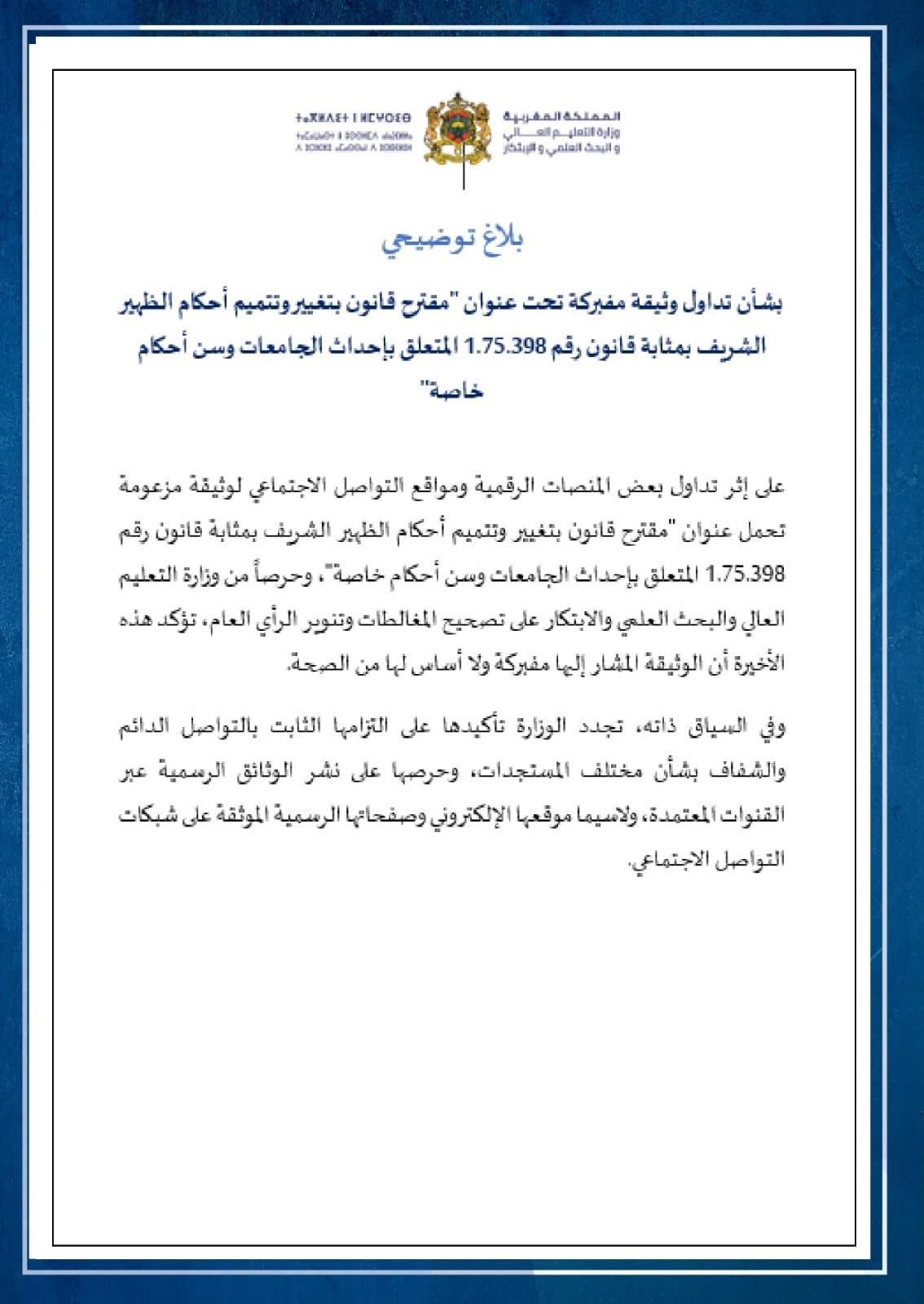 نفت وزارة التعليم العالي والبحث العلمي والابتكار، بشكل قاطع، صحة الوثيقة المتداولة على منصات التواصل الاجتماعي، التي تزعم وجود مقترح قانون يقضي بإنشاء كل من “جامعة الشيخ ماء العينين” بكلميم و”جامعة مولاي علي الشريف” بالرشيدية.