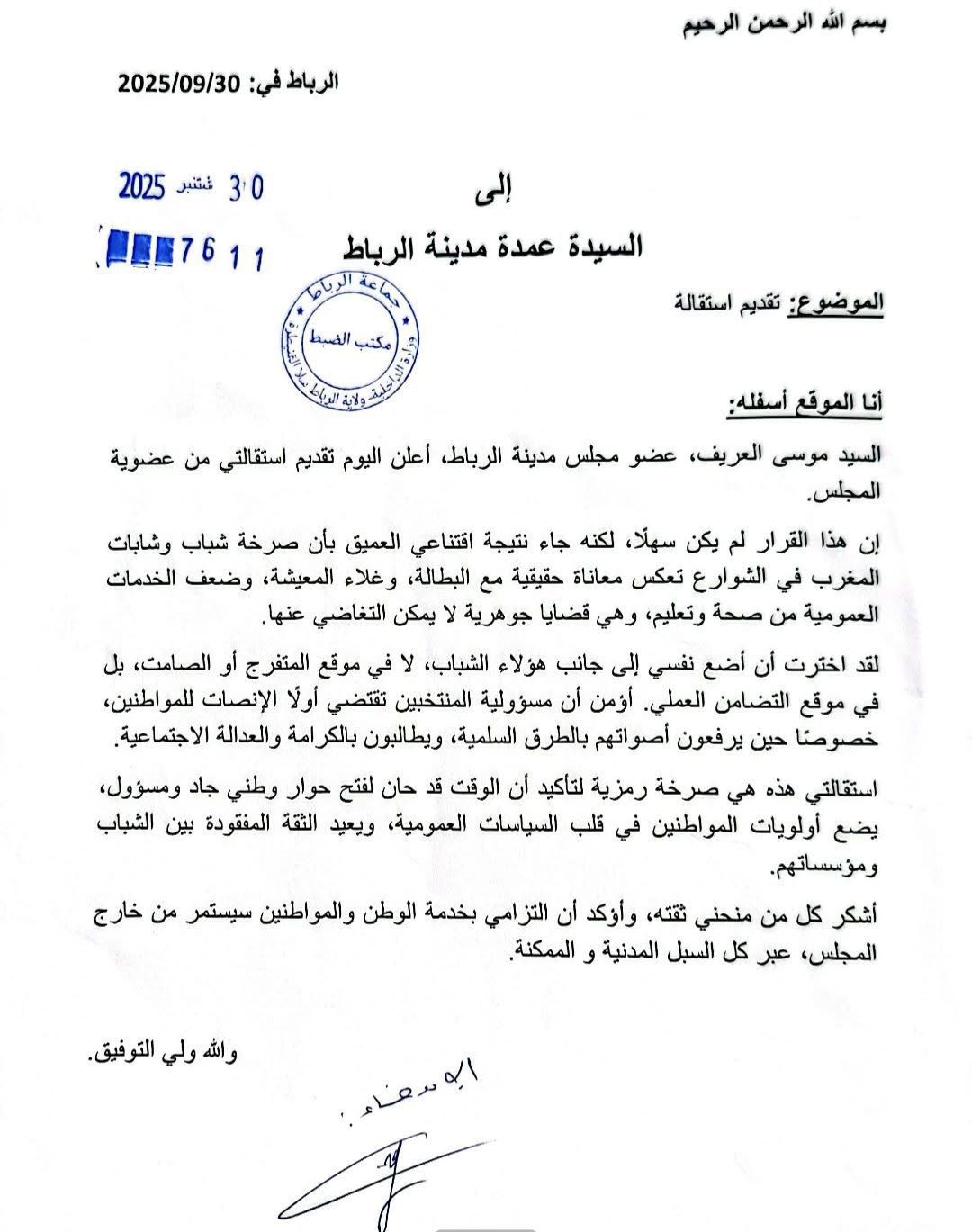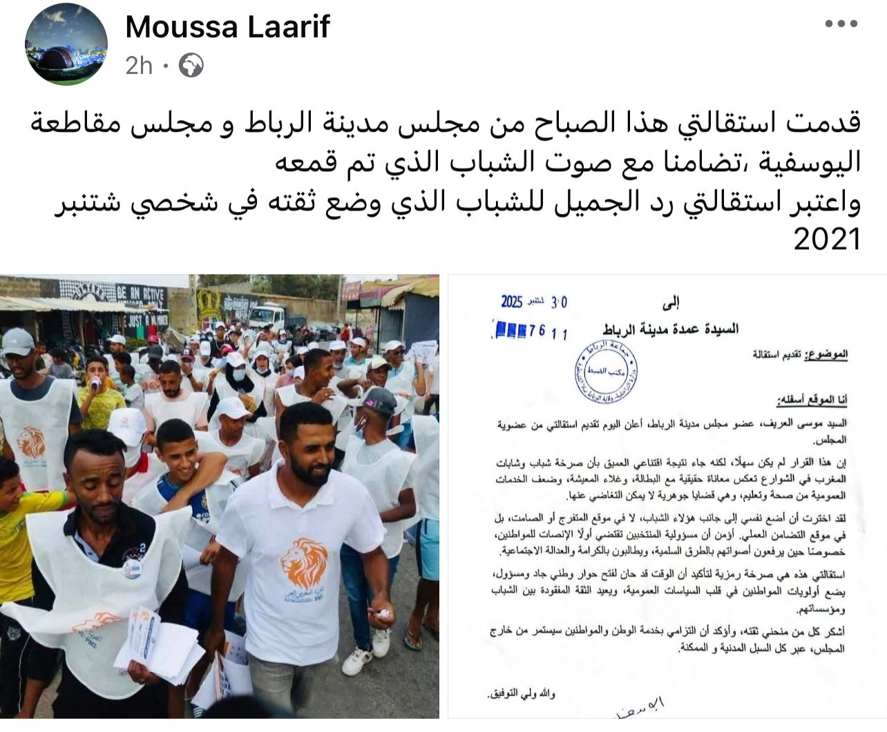 قدّم موسى العريف، عضو مجلس جماعة الرباط، استقالته اليوم الثلاثاء، معلناً تضامنه مع الشباب والشابات الذين يواجهون “معاناة حقيقية مع البطالة وغلاء المعيشة وضعف الخدمات العمومية في مجالي الصحة والتعليم”.
