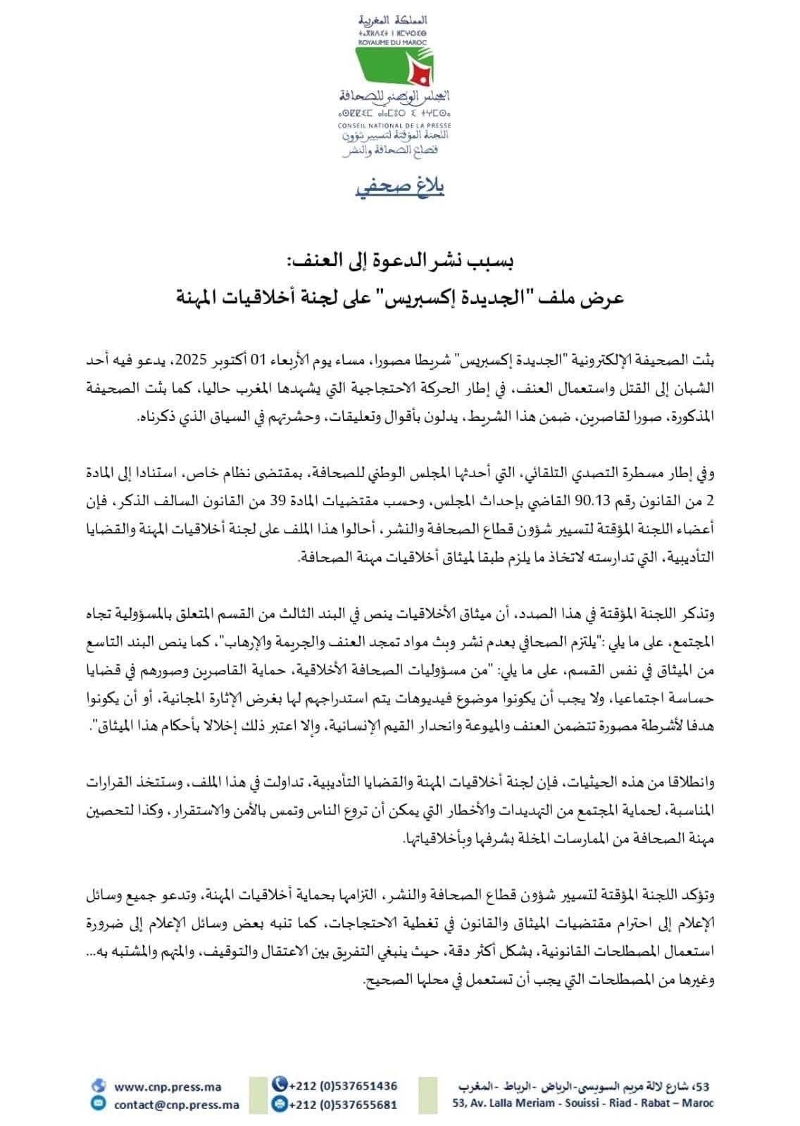 كما أن الدقة في نقل المعطيات والابتعاد عن الإثارة واجب مهني وأخلاقي، خاصة في ظرفية دقيقة تعرفها البلاد، حيث يُستحسن عدم نشر أو بث تصريحات صادرة عن أطفال أو قاصرين في لحظات انفعال جماهيري، لما لذلك من تبعات قانونية وأخلاقية.