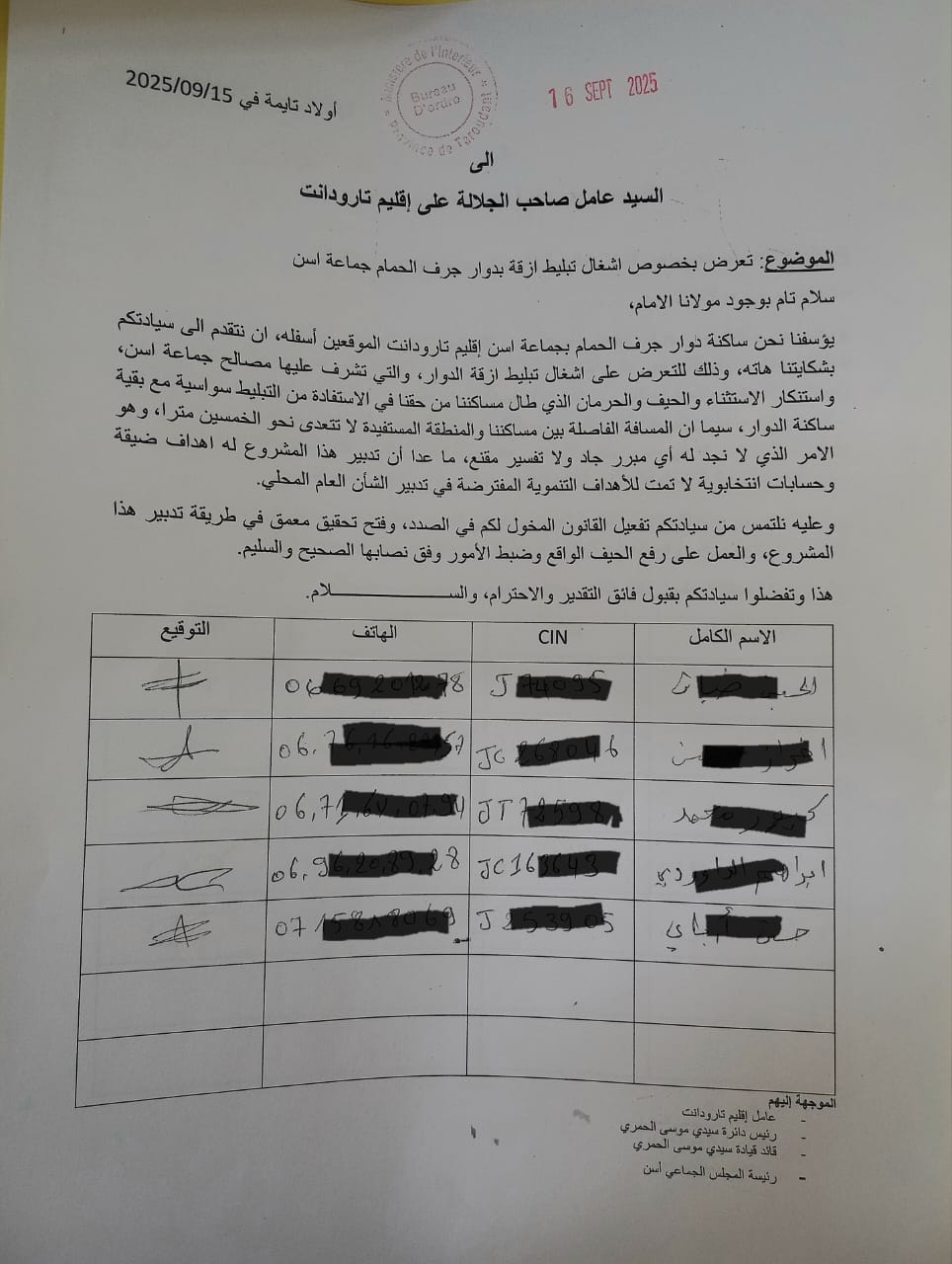 عبر عدد من ساكنة دوار جرف الحمام بجماعة اسن دائرة سيدي موسى الحمري إقليم تارودانت عن تعرضهم وتنديديهم واستنكارهم للطريقة التي يتم بها تنزيل مشروع تبليط ازقة الدوار ب”البافي”، بعد تفاجئهم بإقصاء ممنهج لعدد من المنازل من الاستفادة بمبررات واهية وغير منطقية.