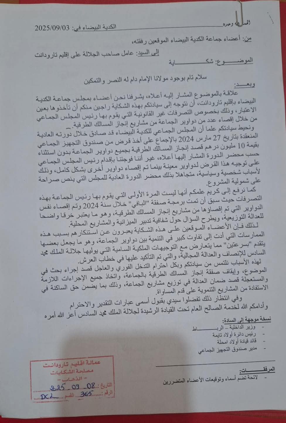 وحسب نفس الشكاية فالمجلس الجماعي صادق بالإجماع في دورة 27 مارس 2024 على قرض بقيمة 10 ملايين درهم من صندوق التجهيز الجماعي، بهدف تحسين المسالك الطرقية لجميع دواوير الجماعة، لكن المفاجأة كانت في توجيه الرئيس لهذا القرض نحو دواوير محددة، مع استثناء دواوير أخرى.