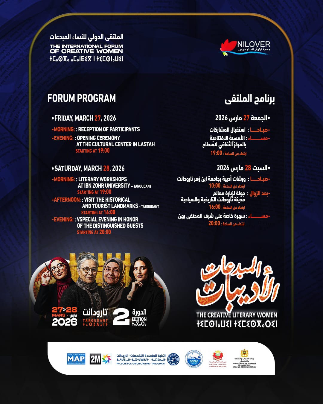 وفي إطار الاحتفاء بالمرأة في شهر مارس ودينامية المجتمع المدني بجماعة تارودانت تنظم جمعية نيلوفر لنساء سوس الملتقى الدولي للنساء المبدعات بتارودانت في نسخته الثانية تحت عنوان: “الأديبات المبدعات” وذلك يومي 27 و28 مارس 2026 بشراكة مع المجلس الجماعي لتارودانت والمديرية الإقليمية لوزارة الشباب والثقافة والتواصل بتارودانت- قطاع الثقافة والكلية متعددة التخصصات ابن زهر.