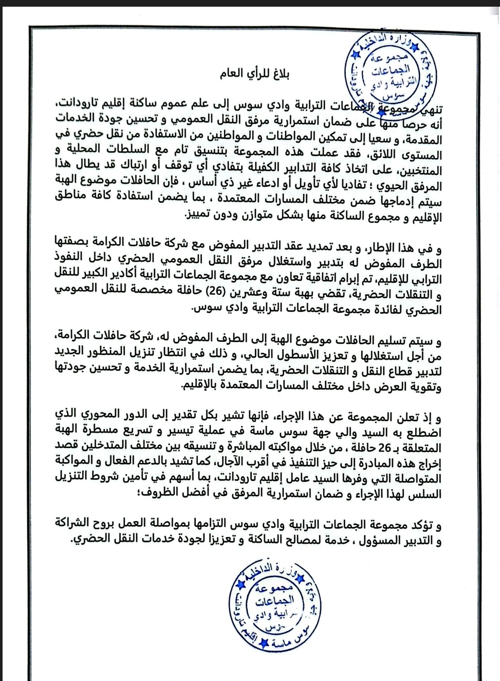 البلاغ أشار إلى تمديد عقد التدبير المفوض مع شركة “حافلات الكرامة”، وإبرام اتفاقية تعاون مع مجموعة الجماعات الترابية أكادير الكبير، تقضي بمنح 26 حافلة لفائدة مجموعة وادي سوس لتعزيز الأسطول الحالي. كما أبرز الدور المحوري لوالي جهة سوس-ماسة وعامل إقليم تارودانت في تسريع مسطرة هذه الهبة وضمان تنزيلها بسلاسة.