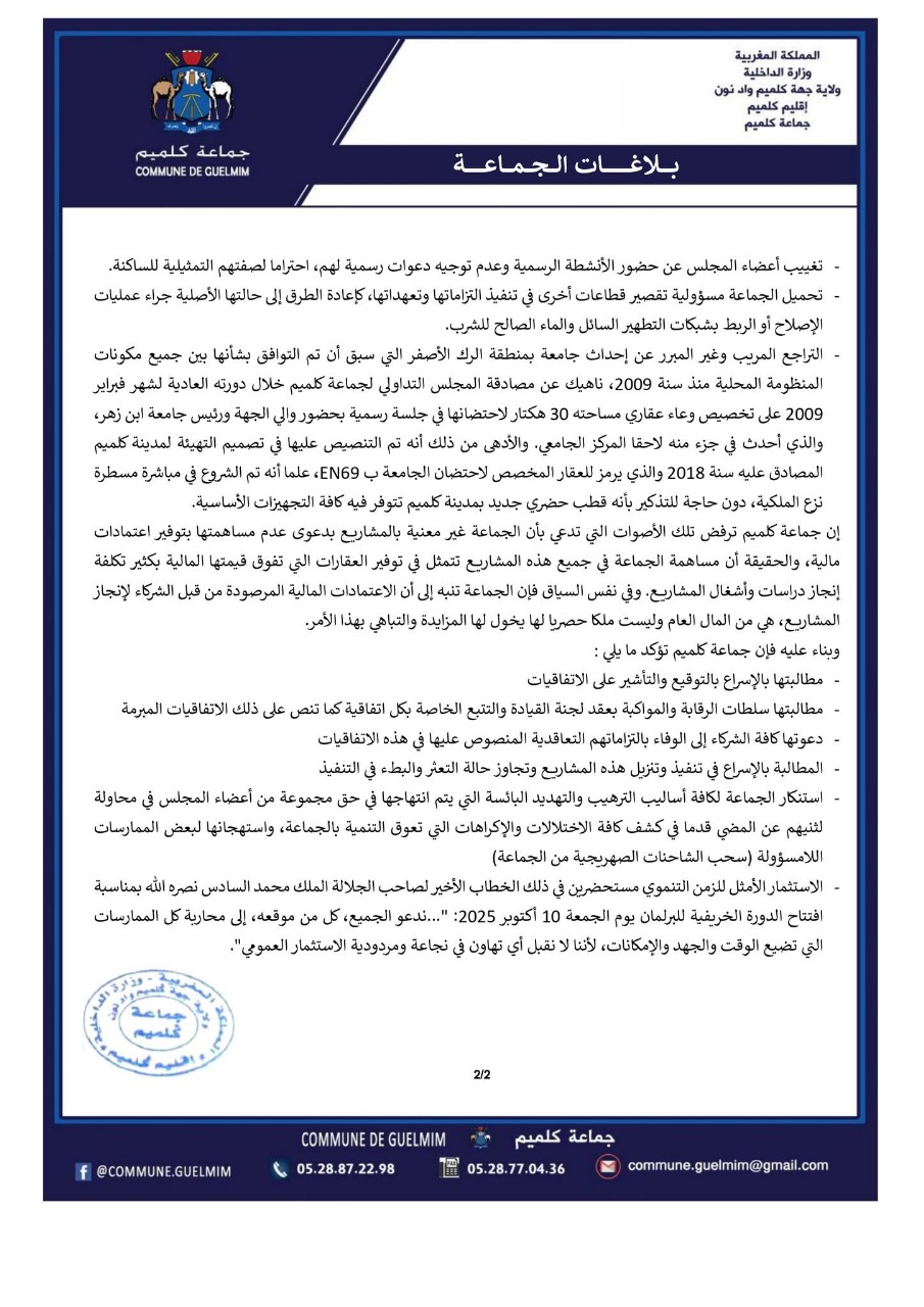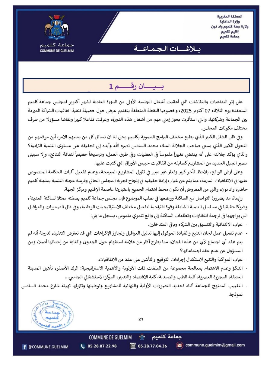 وفي خضم تفاعل الرأي العام مع الكلمة التي انتشرت على نطاق واسع، أصدر المجلس الجماعي لكلميم بياناً يوم الإثنين 13 أكتوبر 2025، أكد فيه وجود ما وصفه بـ”غياب إرادة حقيقية لإنجاح تجربة المجلس الحالي”، متهماً بعض الجهات بـ”فرملة عجلة التنمية” وتعطيل تنفيذ المشاريع المبرمجة، إلى جانب “عدم تفعيل آليات الحكامة المنصوص عليها في الاتفاقيات”.