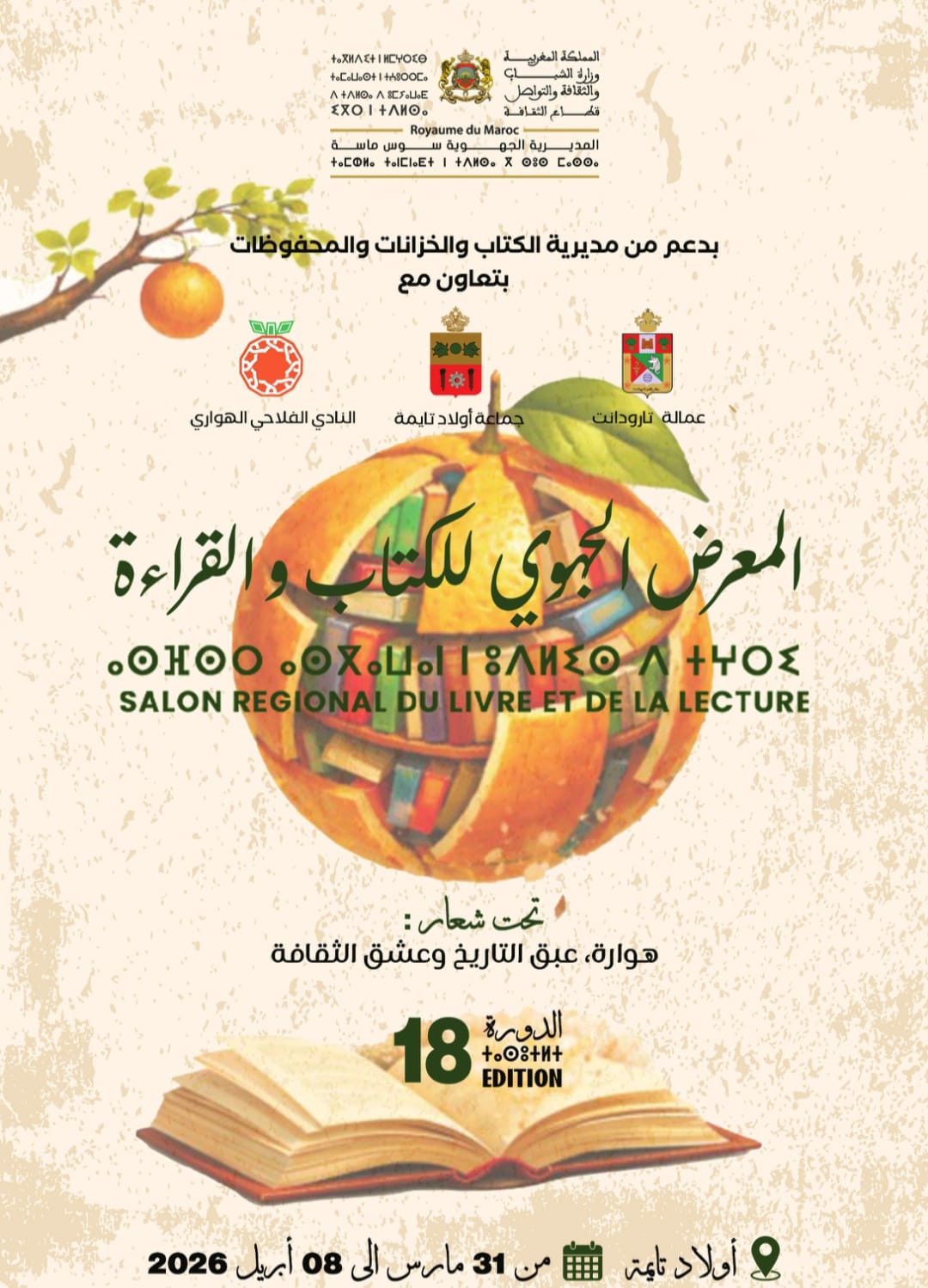 في إطار إستراتيجية وزارة الشباب والثقافة والتواصل – قطاع الثقافة، الرامية إلى النهوض بصناعة الكتاب والنشر ودعم الفاعلين في المجال على المستوى الوطني والجهوي والمحلي، تنظم المديرية الجهوية للثقافة لجهة سوس ماسة، بدعم من مديرية الكتاب والخزانات والمحفوظات، وبتعاون مع المجلس الجماعي لأولاد تايمة والنادي الفلاحي الهواري، الدورة الثامنة عشرة (18) للمعرض الجهوي للكتاب والقراءة، تحت شعار: “هوارة: عبق التاريخ وعشق الثقافة”، في الفترة ما بين 31 مارس و08 أبريل 2026، بمدينة أولاد تايمة، بمشاركة عدد من المؤسسات العمومية والجمعيات الثقافية ودور النشر ومهنيي الكتاب على الصعيد الوطني والجهوي والمحلي.